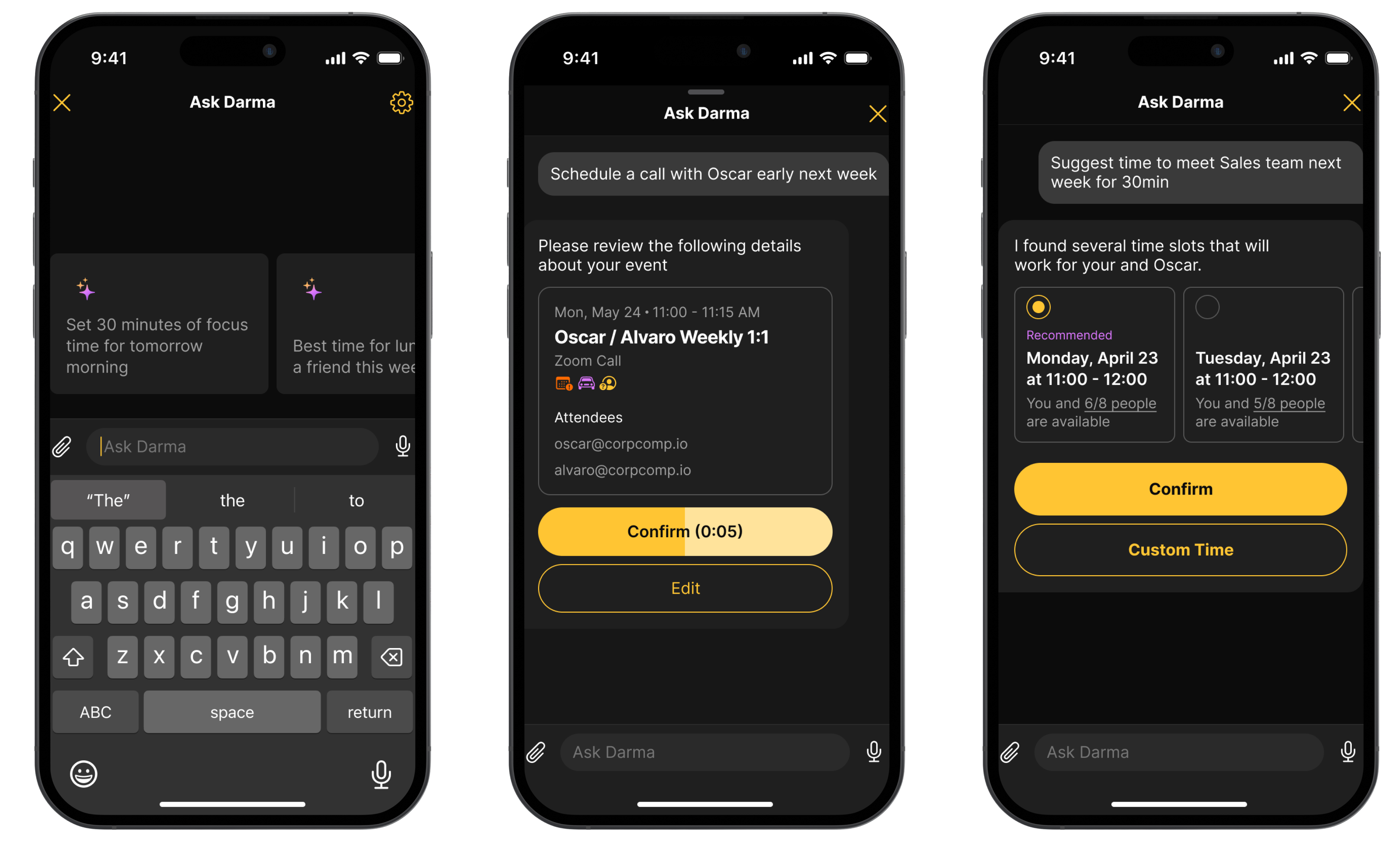 Darma is a smart scheduling assistant that automates meeting coordination, resolves conflicts, and helps users manage their calendar using multimodal inputs like voice, text, and snapshots.