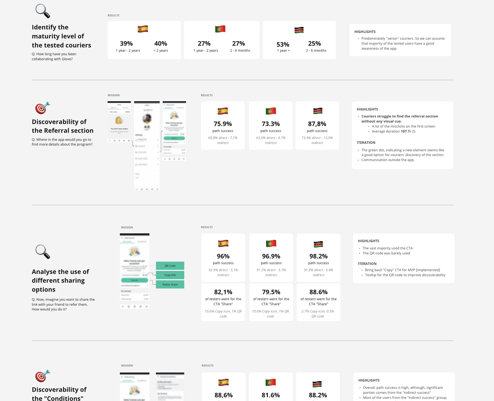 Before proceeding with design implementation, I wanted to conduct a final round of validation by performing usability tests with a larger sample of users. With the assistance of research ops, we recruited over a thousand testers across three markets: Kenya, Portugal, and Spain. All testers were active Glovo couriers. The overall results were positive, with the majority of users having no issues completing the tasks. However, there were several small changes I wanted to implement based on the test results, such as some copy iterations.