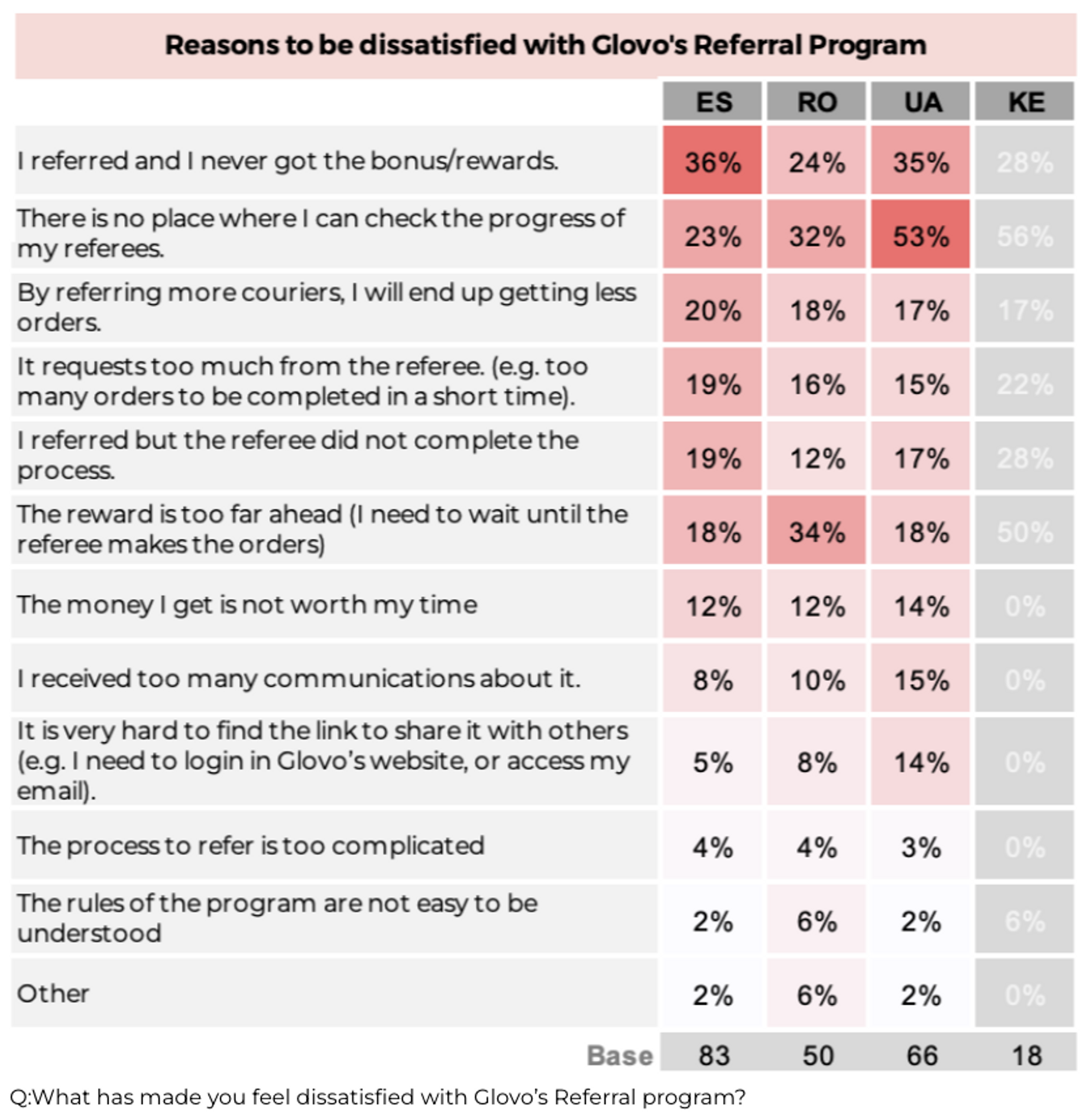 Survey results showing highest friction points with the current Glovo's referral system.