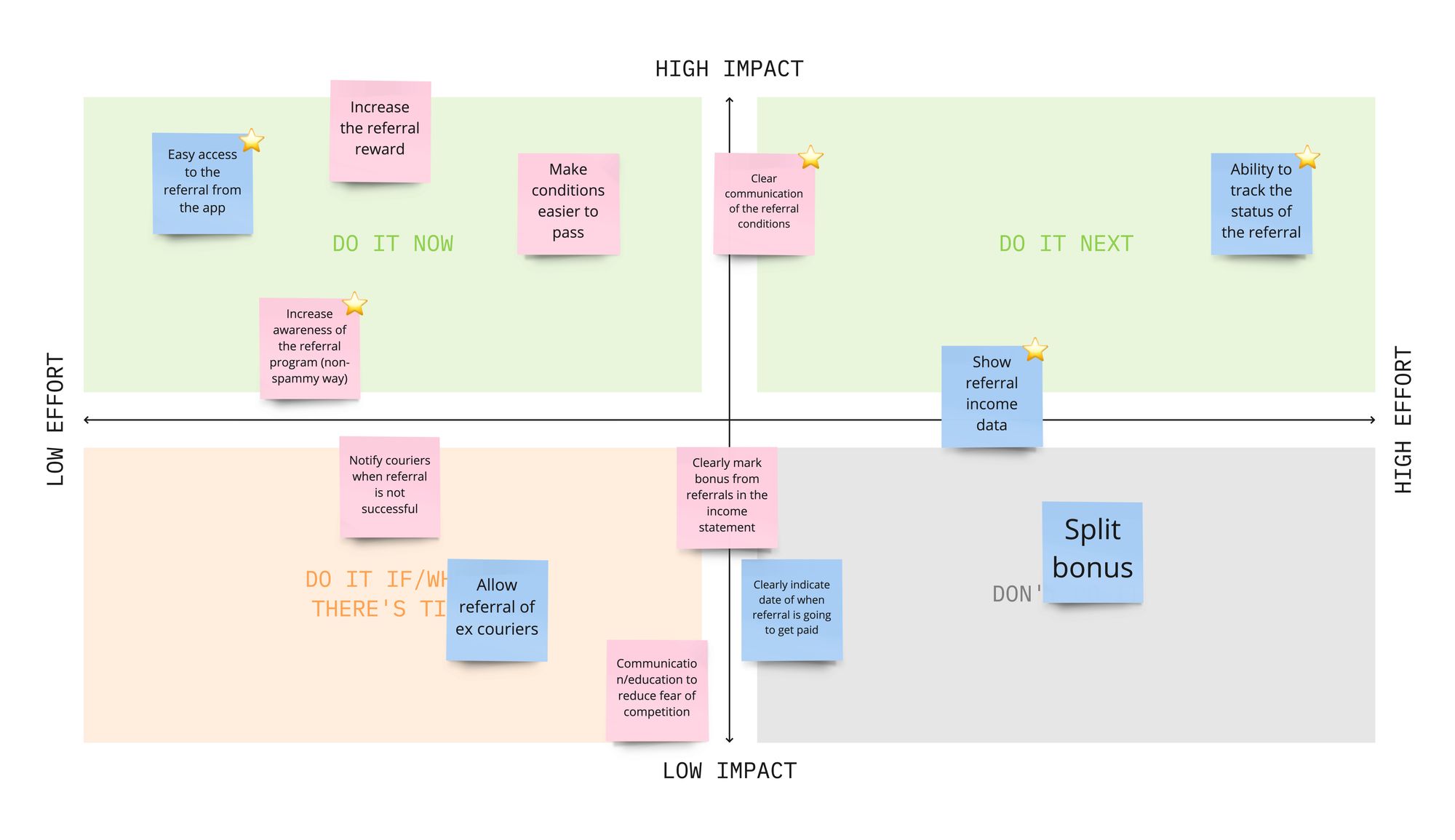 2x2 matrix used to help prioritise gain creators/ pain relievers. The ones that are marked with the star were prioritised.
