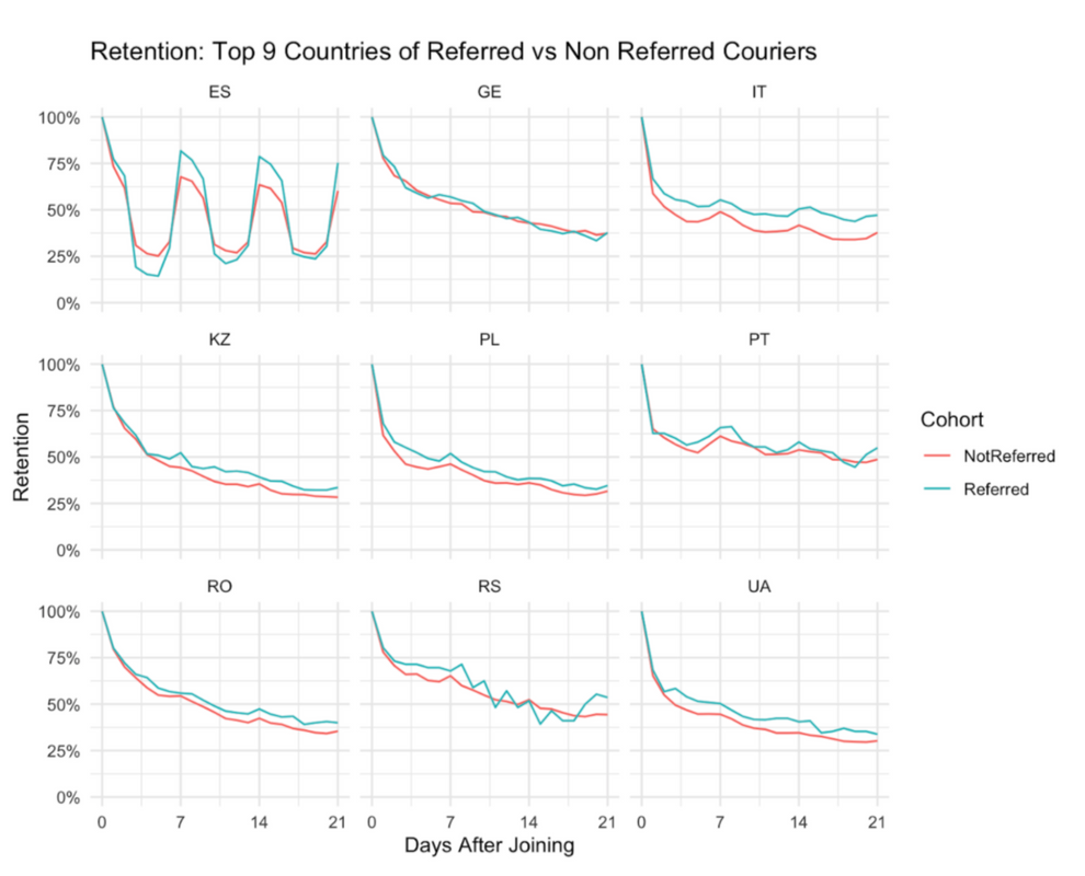 Retention rate of couriers of referred vs non-referred couriers