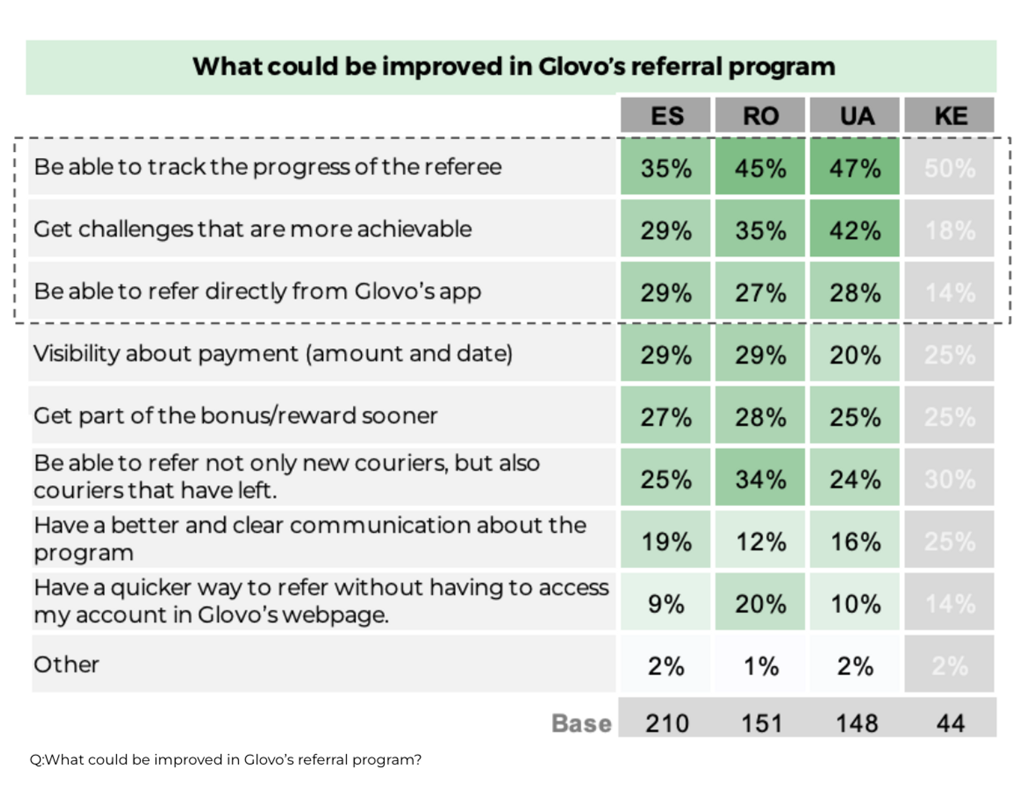 Survey results highlighting what could be improved in Glovo's referral system.